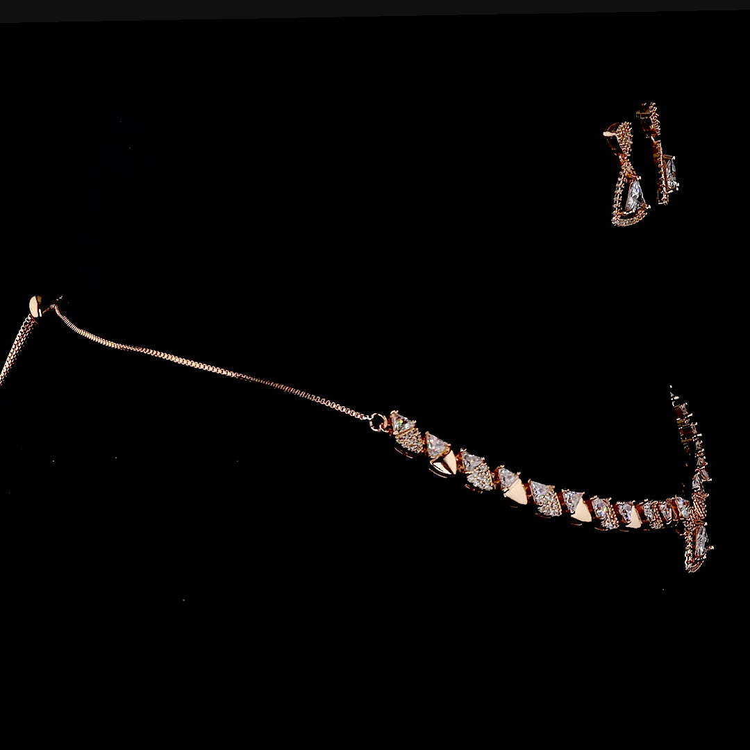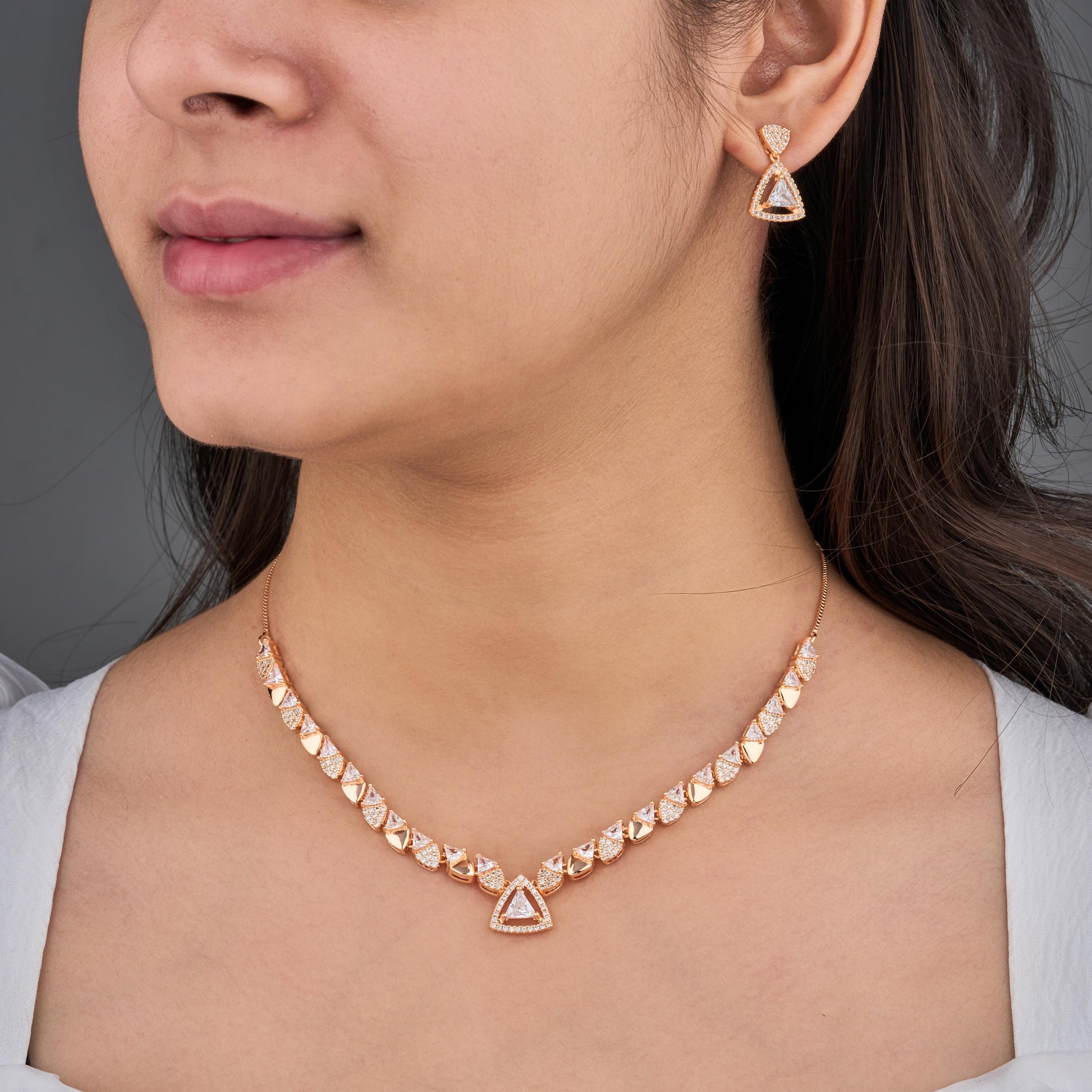 This elegant rose gold necklace and earring set showcases a beautifully crafted geometric design adorned with sparkling crystal stones. The gracefully arranged necklace creates a stunning neckline statement, while the matching drop earrings add a touch of refined glamour. Finished in a polished rose gold tone, this set exudes sophistication and modern elegance. Lightweight and comfortable, it is perfect for weddings, festive celebrations, and special occasions. A timeless statement set that pairs effortlessly with ethnic, bridal, and contemporary outfits.